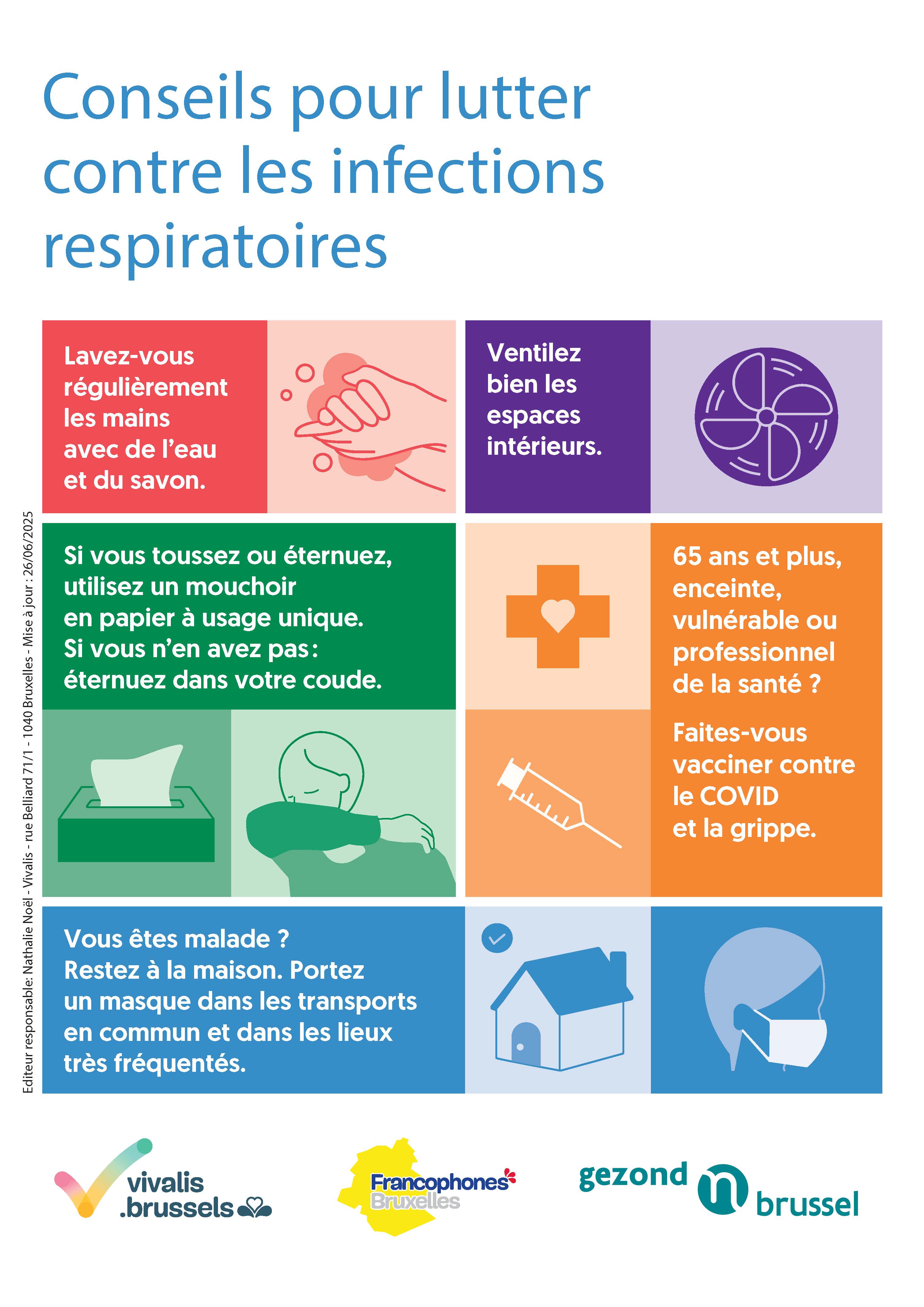 La campagne sur les gestes barrières lancée par Vivalis a pour but de rappeler aux Bruxellois.es que le respect de réflexes simples permet de réduire le risque de contracter ou de propager des maladies infectieuses respiratoires : covid, grippe, etc.