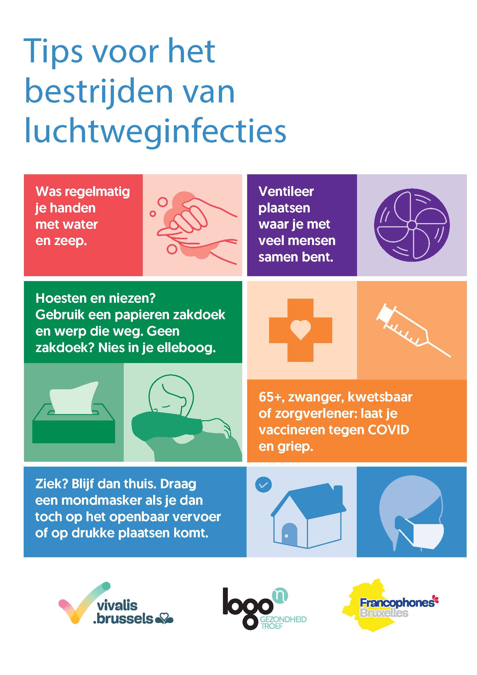 Meer informatie over de aanbevelingen is beschikbaar op de website van de FOD Volksgezondheid: Winterplan luchtweginfecties - Communicatiemateriaal | FOD Volksgezondheid